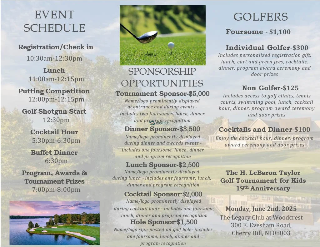 Tournament Sponsor- $5000: Name/logo prominently displayed at entrance and during all events, 2 foursomes, lunch, dinner, and program recognition.